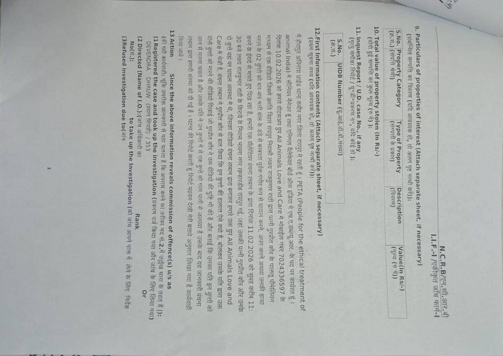 मामले की जानकारी मिलते ही पीपल फॉर द एथिकल ट्रीटमेंट ऑफ एनिमल्स इंडिया, यानी People for the Ethical Treatment of Animals (PETA) ने डीसीपी नॉर्थ, एसीपी तथा खमरडीह पुलिस स्टेशन के अधिकारियों से संपर्क कर तत्काल कार्रवाई का आग्रह किया। स्वयंसेवकों के सहयोग से भारतीय न्याय संहिता (BNS), 2023 की धारा 325 के तहत प्रथम सूचना रिपोर्ट दर्ज कराई गई। यह धारा किसी भी पशु को अपंग करने या मारने को संज्ञेय अपराध के रूप में वर्गीकृत करती है, जिसके लिए पाँच वर्ष तक के कारावास, जुर्माना या दोनों का प्रावधान है।